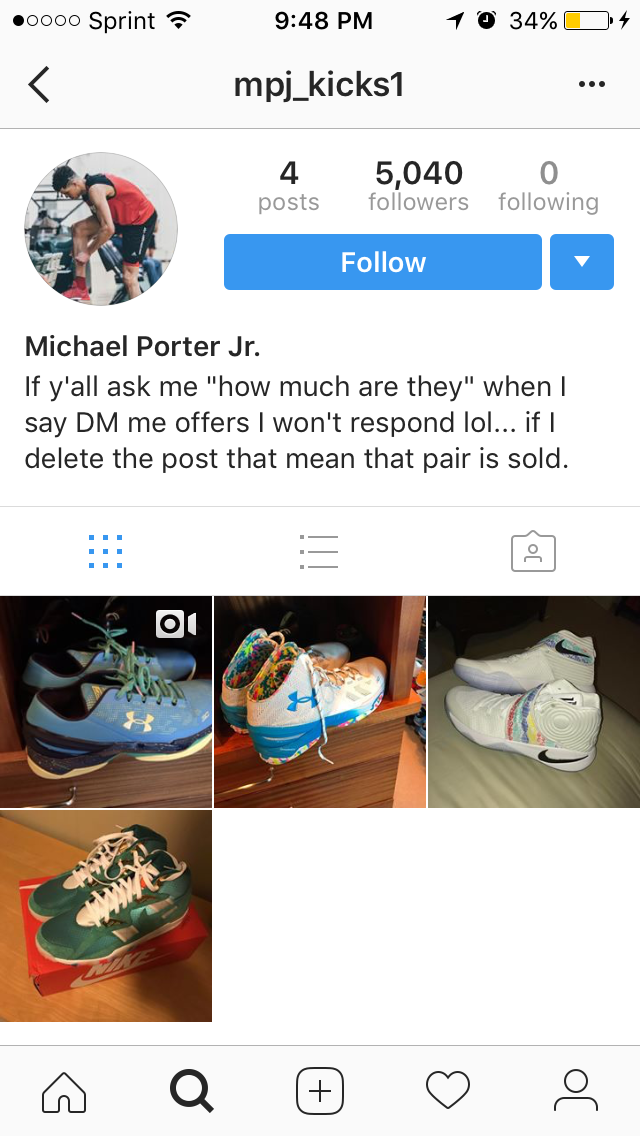 I recently started to follow Michael Porter Jr. after Washington axed their coach LoRenzo Romar a few weeks ago. He had a chance to rethink his shitty decision of going against the grain by commiting to a non "one and done" program like Kentucky, Duke etc. But this dummy decided to take the road less traveled at Missouri. I got a kick out of seeing that his Dad is joining the staff as an Assistant coach. No big deal, that certainly worked out well for Ben Simmons. Also remind you its that Missouri to which i dont know what sport the school hangs their hat on anymore. I hope he can produce and take the reigns from ole Chase Daniel country. But thats not the issue im attempting to bring up. I see an IG story of his last week (that i forgot to screenshot) of him saying to follow his IG shoe page.